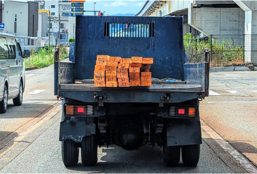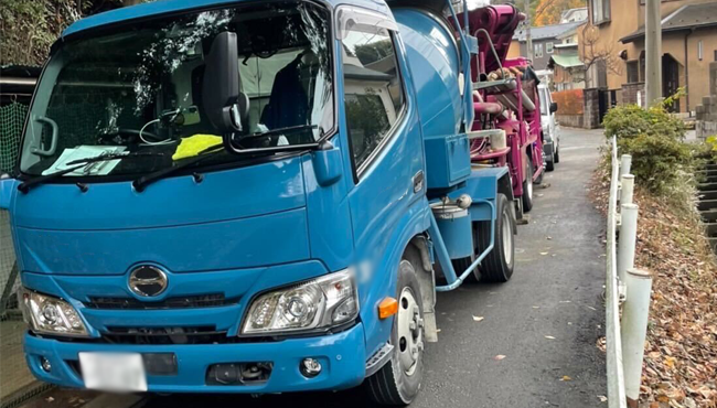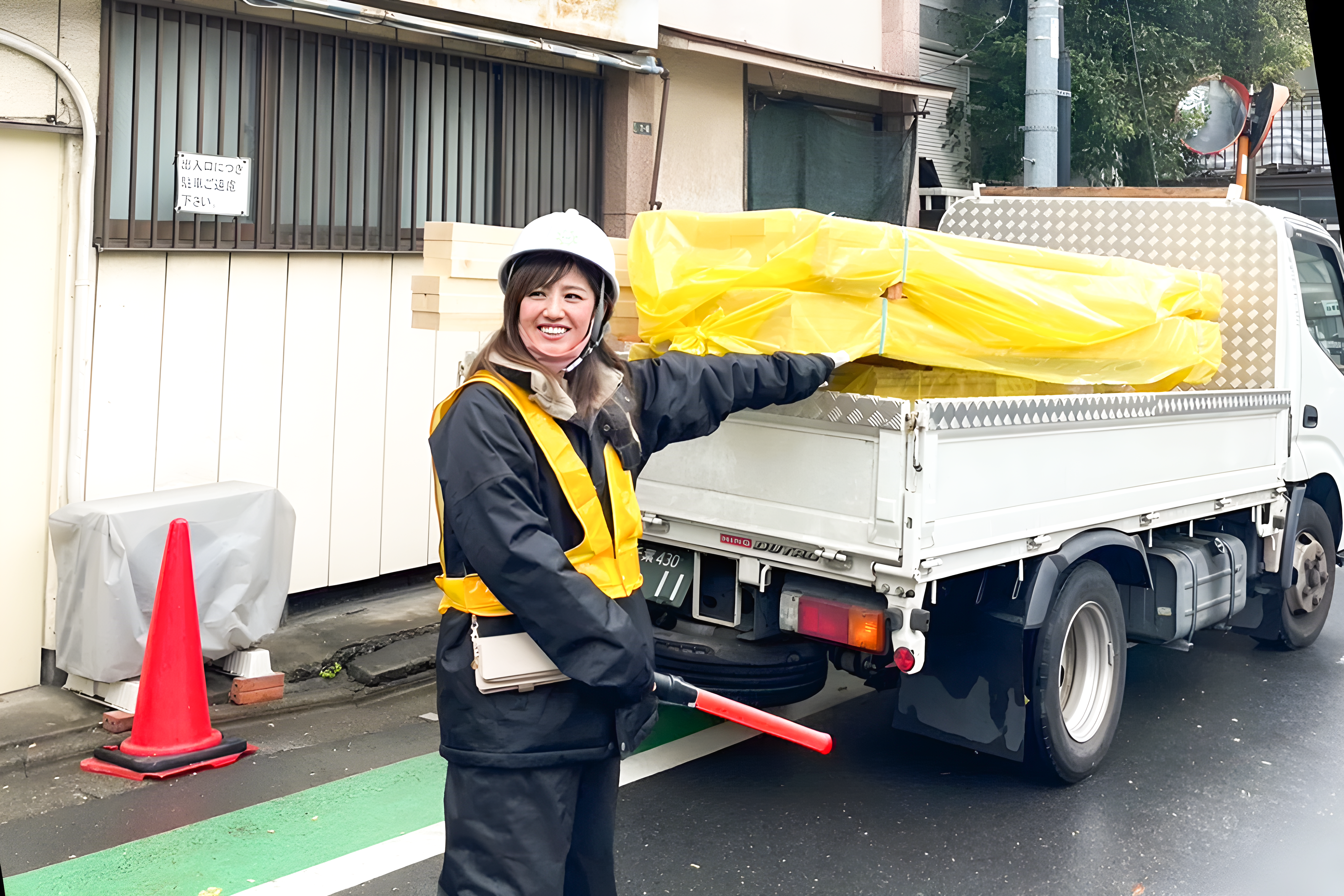 トラックが来たら作業開始です。現場の周辺の人や車が安全に通れる ように誘導します。